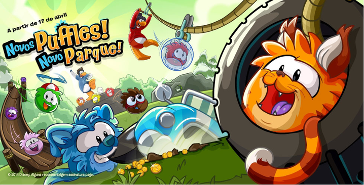 Temos uma nova página inicial bem legal na entrada do site do Club Penguin. Ela mostra os novos puffles que teremos este mês e um pouquinho do Parque Puffle. Ambas novidades estarão chegando ao Club Penguin no dia 17 de abril.